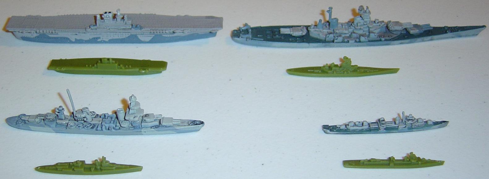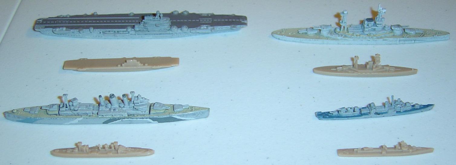 Here are some comparisons with A&A board game pieces and their A&A Naval Miniatures counterparts.  I’ve got all 6 sets of the Naval Miniatures but in some cases, I wasn’t able to find the correct class of ship that is the same as the board game class so I used a ship that came closest in appearance.  Also, I didn’t bother with submarines or transports because there wasn’t enough of them in the Naval Miniatures sets.  First we go with Allies: