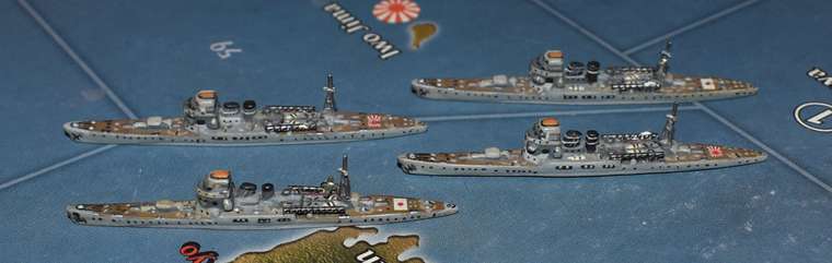 My long time friend and playing partner and I decided a while ago to paint our pieces, and although it’s a slow process, we’re having fun with it while getting it done. It started with a house rule that you had to build your long range planes if you got that tech, rather than have all your on the board planes get it immediately, due to that tech having game breaking effects on a few of our games. So I bought decals from HBG to differentiate some planes from others, and it took off from there until we decided to paint everything. We’d both painted our fantasy miniatures when we were in high school, but my pal, I’ll call him FJO, went on to become a professional painter. Not the typical interior/exterior house painter, but a master at faux finishes, working on auto show displays, museums, and stuff like that. When he decided to paint navies while I was doing aircraft, he knocked out the British navy in about a month. Then when he moved to the Japanese navy, him being a player who likes playing Japan, things began to slow down. He started with the destroyers, then found some interesting camo patterns while doing research and did a camo fleet. His first carrier was the Shokaku, and he hand painted it to look like the picture I’d printed for him of a schematic of the ship. But he was bothered that it was a Shinano sculpt, so I convinced him to chop the conning tower/bridge off and move it to the other side to see what it would look like. Well, although I glued the tower on the other side, that sculpt still sits unpainted, but it got FJO to thinking. Next think I knew, I was helping him cut down one of the 5 OOB Akagi’s I bought on sale from HBG to make a Zuiho. He has some putty that he uses to build up the bow or stern, or add guns if necessary, and he’s used it to great effect. He even read that the Takao cruisers had to be modified because they were top heavy, and only 2 were modded, so he modded 2 cruisers as well. He’s taken the Akagi sculpt and made a Zuiho, a Shoho is under construction, a Kaga, Hiryu, and Soryu. He used a Shinano sculpt to make a Zuikaku (since the Shokaku was made from one and they’re sister ships), and cut 2 down to make a Ryujo and the Amagi. So without further ado, here are some pictures of his carriers. First, the Shinano as Shokaku and with an Akagi tower for accuracy, the Zuikaku: